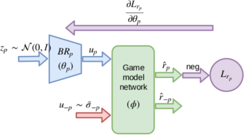 We present DeepFP, an extension of fictitious play for finding nash equilibrium of two-player zero-sum games in continuous action spaces. DeepFP represents players’ best responses via generative neural networks which are highly expressive implicit density approximators and trains them end-to-end in an actor-critic style framework.