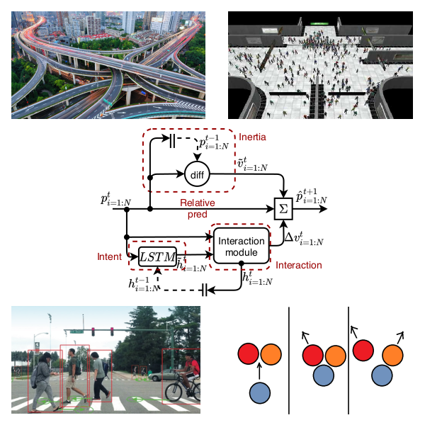 We present an architecture to address the challenge of trajectory prediction for scenes with multiple agents and entities. We model crucial inductive biases of motion, namely, inertia, relative motion, intents and interactions via a relational model to flexibly capture interactions between agents in diverse environments. Specifically, we propose a novel attention mechanism which models interactions by making continuous-valued (fuzzy) decisions and learning the corresponding responses. Our architecture demonstrates significant gains over existing state-of-the-art models in diverse domains such as human crowds, freeway traffic, sports trajectories and physics.