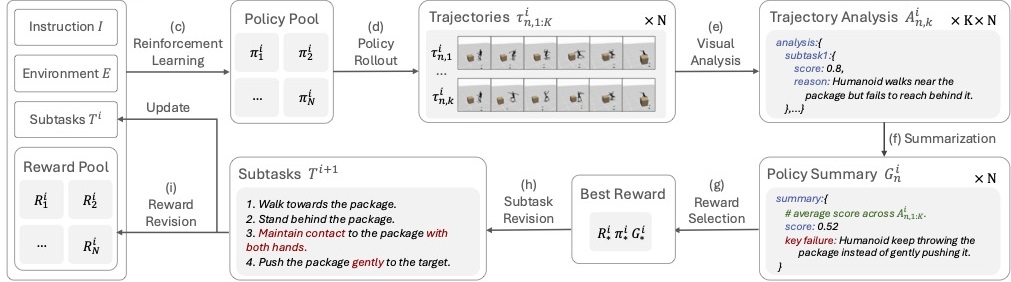 Reinforcement learning typically requires hand-crafted reward functions. We present Reward Design Agent (RDA), a VLM-based agentic framework that automates reward design by using a VLM to generate and iteratively improve reward code given task instructions. It injects semantics into the reward design process by decomposing tasks, performing visual trajectory evaluation, failure mode summarization, and iteratively revises reward code to better follow task instructions. Evaluated on 12 table-top manipulation tasks from ManiSkill and 4 loco-manipulation tasks from HumanoidBench, RDA trains policies that are substantially more instruction-aligned than the current SotA while matching task success rate.